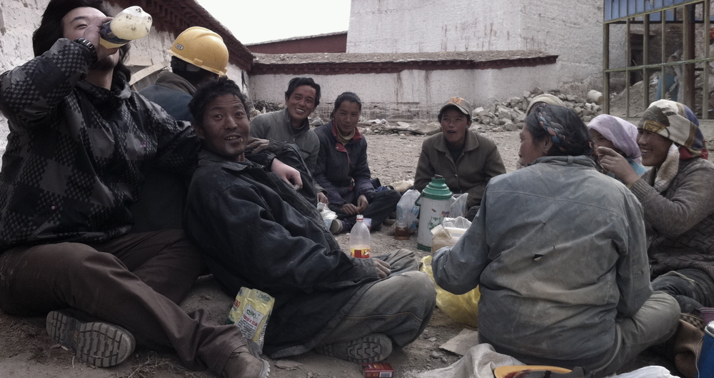 江孜县城,修庙的工友们叫住我请我喝酒,我想可能因为我长得帅吧!哈哈哈哈哈!!!!我和乔路给了他们一包云烟作为交换,大家坐在一起,大口喝着清凉酸甜的青稞酒,